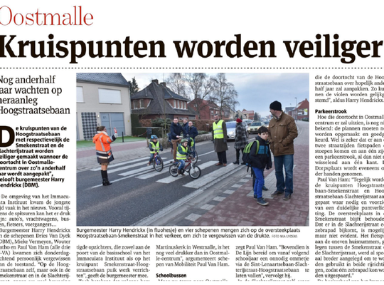 Op vraag van oppositiepartij CD&V ging schepen van mobiliteit Paul Van Ham in gesprek met De Lijn. Er werd een akkoord bereikt om de bussen niet meer te laten wachten in de Slachterijstraat. Over anderhalf jaar wordt de doortocht in Oostmalle onder handen genomen. Bij de plannen zal er blijvend aandacht uitgaan naar de zwakke weggebruiker. “Waar nodig zal puntenverlichting voorzien worden bij de herziening van de kruispunten Hoogstraatsebaan-Smekenstraat en Hoogstraatsebaan-Slachterijstraat,” laat Van Ham weten.